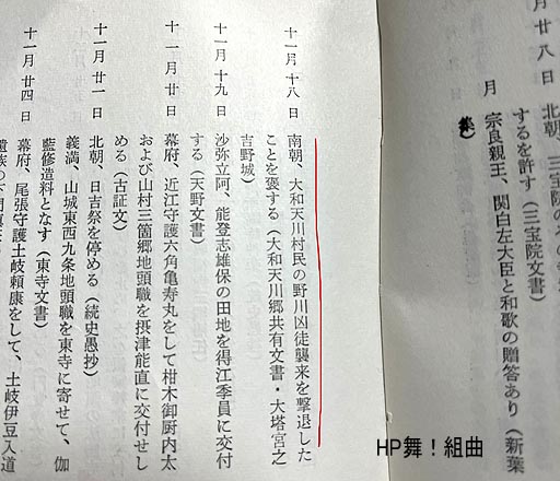 上写真;『南北朝編年史』下巻P.1109(由良哲次著;吉川弘文館、昭和39年刊)天授三年十一月十八日の項に、長慶天皇が天川郷民の活躍を賞したという記載。 同誌上下巻で天川郷に関する記載を見ると、少なくとも五か所でみられた。 延元二(1337)年一月二十四日、後醍醐天皇による課役免除の綸旨。 興国四(1343)年十二月二十七日、後村上天皇による河合寺造営料に関する綸旨。 正平五(1350)年八月二十三日、後村上天皇による課役免除の綸旨。 正平六(1351)年七月七日、後村上天皇による天川郷の米に関する綸旨。 天授三(1377)年の上記の長慶天皇による綸旨である。 なお、上記についての出典は「大和天川郷文書」から『南北朝編年史』に 記載されている。ただ残念ながら拙者はその出典元の文書を見ていない。 |