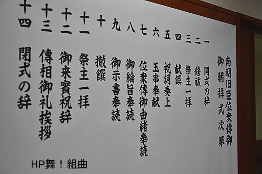 上写真;御朝拝式の式次第。特記すべきは第七番の「位衆傳御」由緒奉読で成立について説明されたこと。 第八番で後村上天皇、長慶天皇の御綸旨が奉読されたこと、 第九に御示書の奉読がされたこと。これは心構えや法度書きであった。 |
