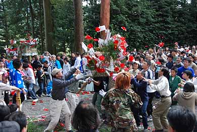 | 上写真2枚、上写真2枚、『花ばい』20本の花が刺してあり、これを奪って荒神様に供えると、厄除けになるという。酒、手ぬぐいや金封も付いており、参拝者に献じる場合は喧嘩になるほどのリアルファイトで奪い合う。氏子域で何本か献じる。参拝者だけでなく、踊子にも献じられる。 | |