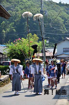 滋賀県長浜市西浅井町集福寺・下塩津神社、 平成25(2013)年8月16日 中踊りが打つ鉦・太鼓の音が「チャカチャンチャン」と響くことから「チャンチャコ踊り」と呼ばれる雨乞い返礼の踊りが、3年ぶりに行われた。 踊子は太鼓打ちが2人、鉦打ち2人そして棒振り2人が踊り、その側らに女性の花笠が側踊りとして控えている。 例年、昼から夜まで町内各所と神社で踊られていたそうだが、今回は道中と神社の境内で2時間ほど行われた。 神社への行列は、前杖・長刀・挟箱・毛槍・立傘・大弓・槍・鉾・チャンチャコ踊り子の順に所どころで奴振りを行いながら進んだ。 集落は敦賀へ抜ける塩津街道から東へ入る位置にあり、集落内の石碑には旧北陸線の中之郷駅方面への案内も残っていた。 背後に北陸への山越えの口に位置し、集落内には小川もあるが、日照りで枯れた場合の打撃は大きかったことであろう。 上記したような交通の要所に位置して、文化の往来もあった集落に、風流な踊りが雨乞いの行事と習合して企画されたのが始まりであろう。 特に側踊りの花笠の異様でありがから風雅な姿は特筆モノだと思う。 末永く伝承されることを願っています。 |