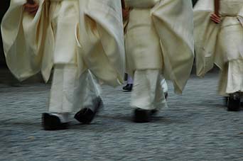 6月15日内宮17:20、祀りの開始を告げる報鼓が通った後方約100m を神職さんが参進される。 内宮正宮板垣内西北隅に御安座される、地主神の興玉神に御神饌を奉奠されるためだ。 忌火屋殿であらかじめ調理され、辛櫃に収められた御神饌(神様の食事)が祝詞奏上・御祓いされた後、辛櫃を担いで興玉神へ向かう。UPした写真は、その一連の祭祀の様子です。 (興玉神は、正宮内のため撮影不可能) |