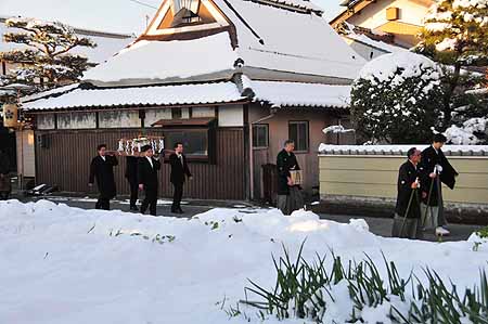 撮影場所&日;滋賀県長浜市八幡中山町 天満宮&頭屋、平成21(2009)年1月25日 撮影機材;Nikon D300+VR18-200mm、D80+SIGMA10-20mm 長浜市へは1988(昭和63)年頃から、年に数回は訪れている。Nロイヤルホテルでの宿泊・温泉や黒壁周辺での食事が目的だが、北陸道の長浜ICからその方面へ行くに通るのが、八幡中山町である。オコナイの撮影は昨年からであるから、まさかそのような目的で何度となく家族で通った場所に一人で撮影に来ようとは、以前は想像だにしなかった。20年も前から八幡中山町を通っていると、その土地がどんどん賑やかになることを痛感する。来る度に新しいスーパーやファーストフード店が開店したりして、発展はとどまることがない。オコナイとは本来、農村部における儀礼であったのだが、いまでは農村部の集落というイメージで八幡中山町を見ることは困難である。それほど発展していく町のオコナイであるが、伝統的な様式美を今に伝えており、今でも様式が保たれていることと、その美しさに感動した。 昭和35(1960)年に出版された【近江祭礼風土記(井上頼寿;臨川書店)】によると、オコナイは3日間、六組で行われていたようである。しかし現在は2日間で、社参本日の前日の宵宮は、頭屋さんへの挨拶で、組は四組となっている。御鏡は外注になっており簡略化し、組の減少は統合が起こったのかもしれない。50年近く前の資料とは変化があっても仕方ないことである。それでも伝統的な御輿型のフネで御鏡を担いで社参し、社参後には御盃の儀が厳粛に行われた。氏子さんは紋付袴か黒の礼服で、正装である。厳粛であってもオコナイとしてはオーソドックスと云えばオーソドックスであろうが、そのようなオーソドックスな様式を守るオコナイが、今では希少ではなかろうか。いくら町がどんどんと変化しようとも、変わらずに伝統様式美を守って欲しいものだと切に思った。 さて、オコナイにおける献鏡には、頭屋からお社あるいはお寺へ社参する際、大きく分けて3パターンの運び方がある。三宝に載せて抱かえて運ぶ、背負う、そして御輿型に屋台に載せて運ぶ方法である。今日、オコナイが行われた滋賀県長浜市八幡中山町の四組が天満宮に献鏡されるには、御輿型屋台を四人で担いで社参された。 八幡中山町のオコナイ、事前情報が殆ど無かったので、自宅を午前4時に出発した。長浜市の八幡中山町には午前5時19分に着いたが、まだまだ街は深い眠りの中であった。結局、献鏡行列は午前8時の天満宮祭典に間に合うように頭屋を出発した。 今回も現地の人たちの情報などで助けを受けての撮影となり、皆様に感謝申し上げます。 |