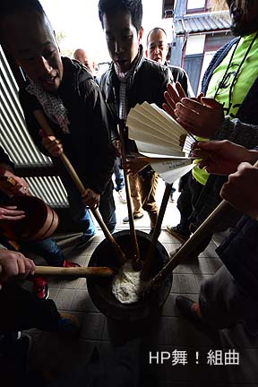 杵と臼を担いで集落内を周られる時に、立ち会わせて頂いた。 新築された、結婚や出産されたとか慶事のあった家を訪れ、玄関先で 伊勢音頭を唄いながら棒杵で御餅搗きをされる。御餅は杵の先に載せて 天井に押し当てていくのだ。手の届かない、つまり掃除が困難な処に 御餅の欠片が付着したままになるのだが、神霊宿る御餅は魔除けにも なるということだろう。このように杵臼を持って集落内を巡回する オコナイは初めて拝見したが、お酒が入って賑やかに搗かれる様子は 見ていて、楽しいオコナイであった。 突然の訪問で、失礼致しました。 |