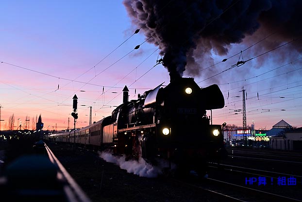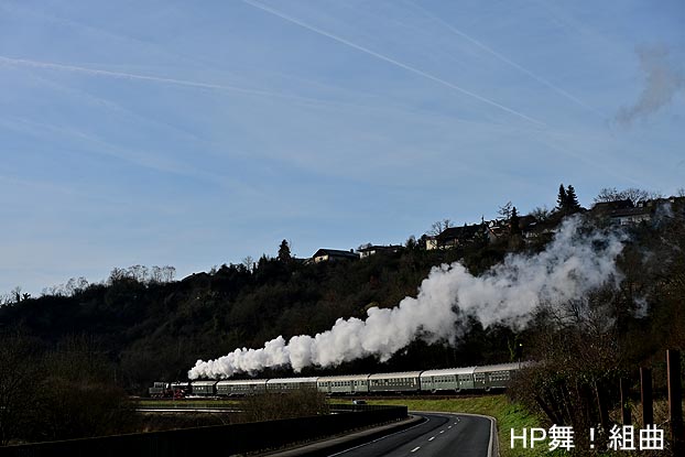 ■ 2025年12月27日 撮影 Landkreis Limburg-Weilburg in Hessen 列車の中で温かいワイン(Glühwein)を楽しみながら Wintermarkt (冬の市場) 見物に行く という蒸気機関車が牽引する特別列車が、12月27日に走った。 Eisenbahnfreunde Treysa e.V.が企画した列車でTreysaとLimburgの間を走る 牽引機は調子が良いのかあちこちで引っ張りだこの Lok35ー1097号機で、余裕綽々 の走りだった。 Runkelで撮影後、復路のスジはWetzlarへも追いかけて発車を撮影した。 |